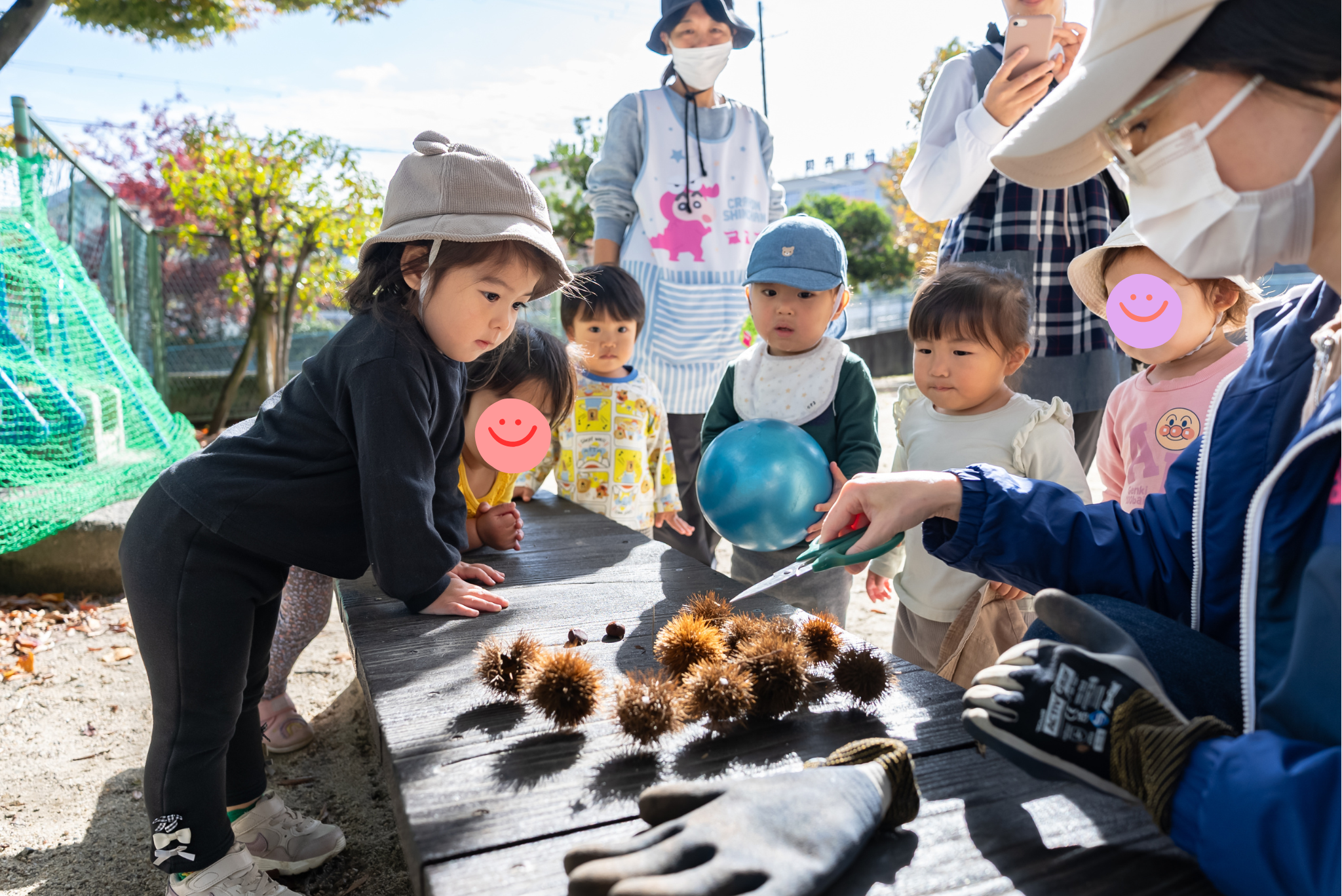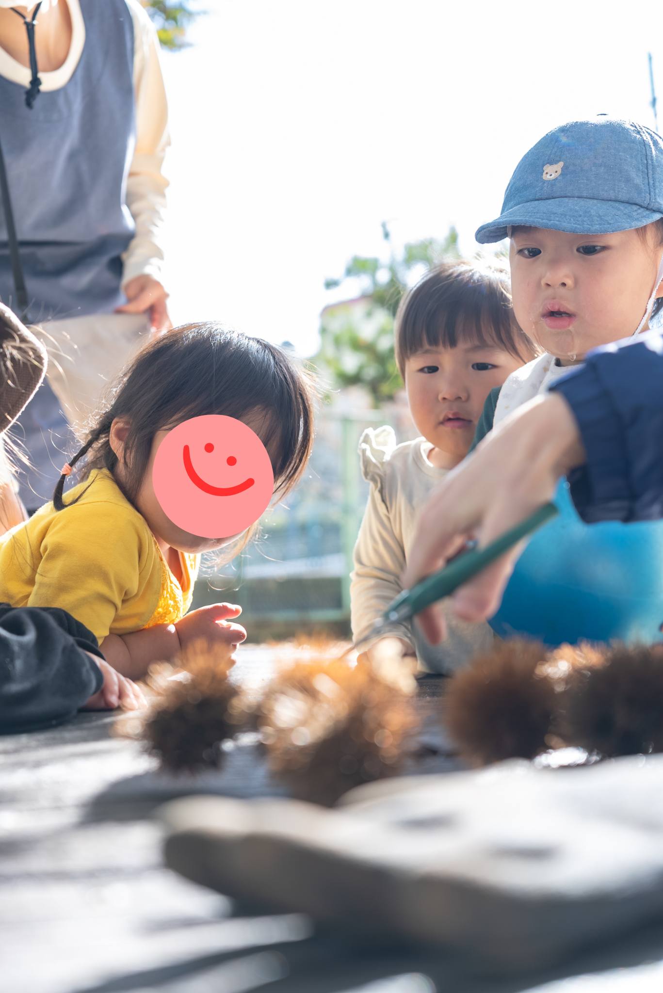 とげとげの中から栗が出てくる様子を興味津々で見つめていました🌰✨
