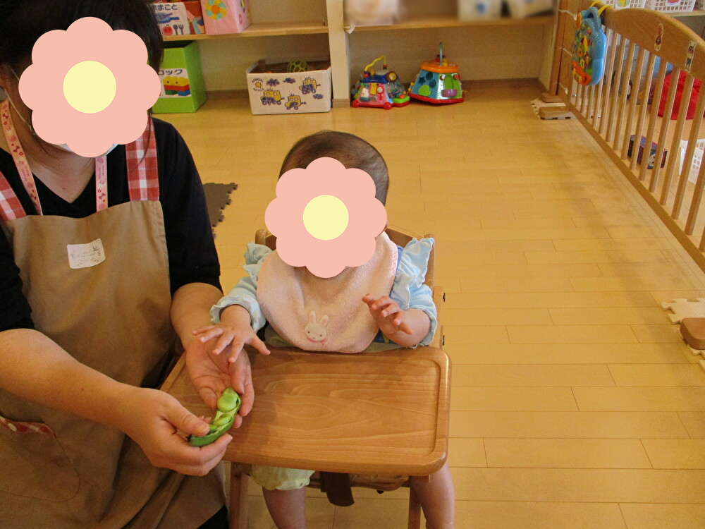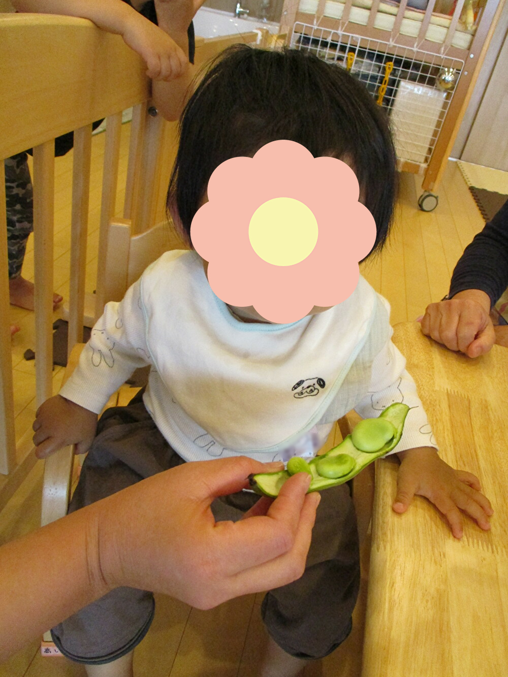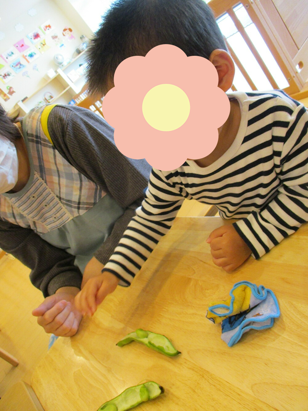 今日は、食育の一環として、そらまめの皮むきに挑戦しました(#^^#)