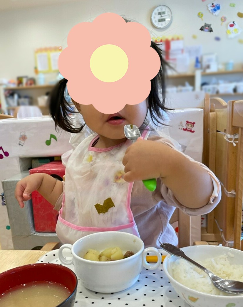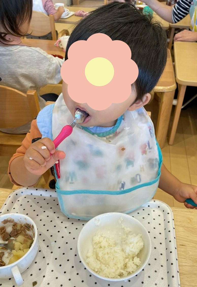スプーンやフォークを使って、自分でしっかり食べています☆