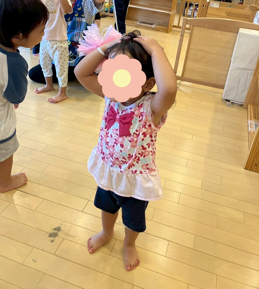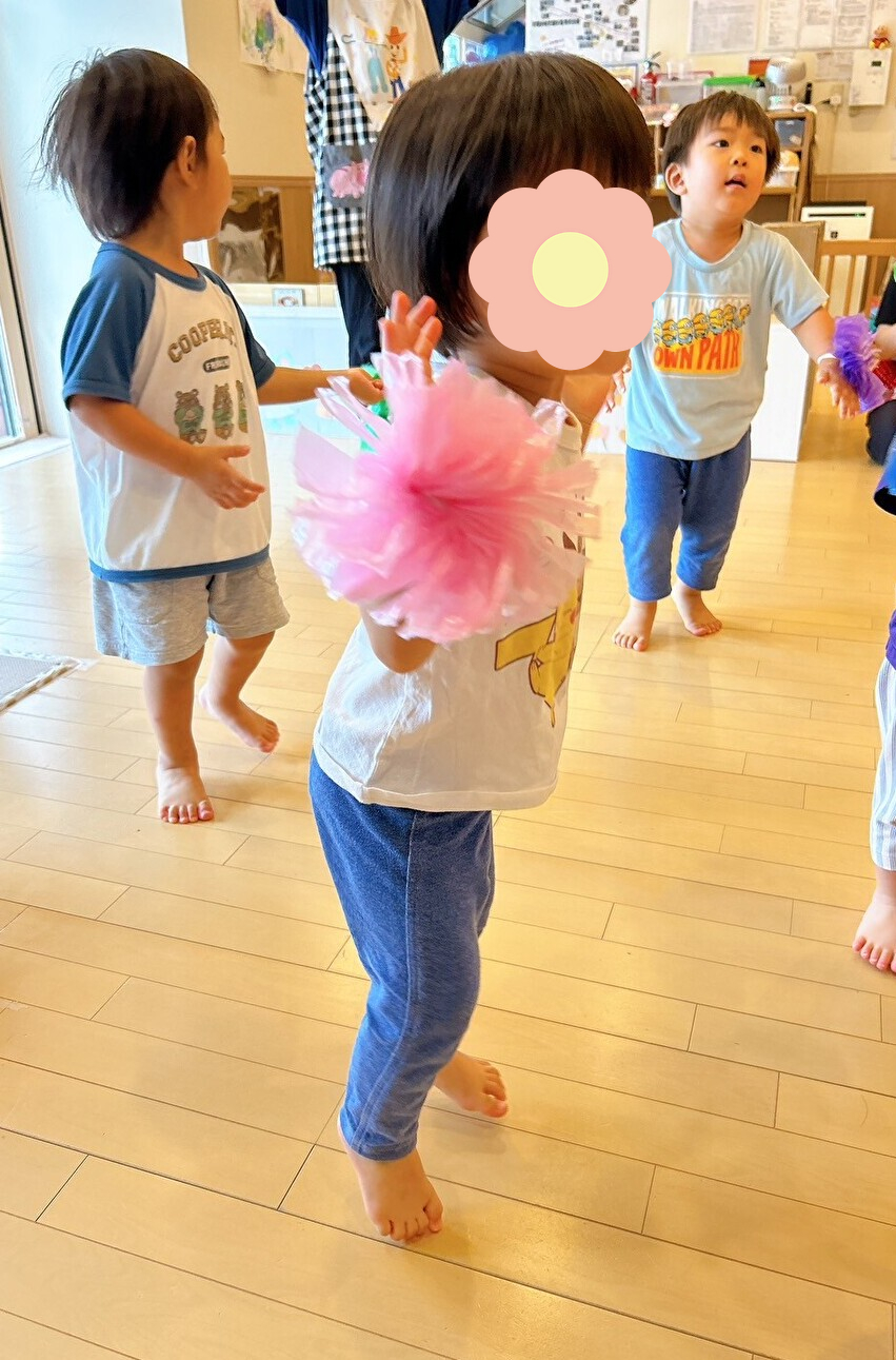最後に、先生手作りのポンポンをつけて、『バナナくん体操』の曲に合わせて体操をしましたよ♪