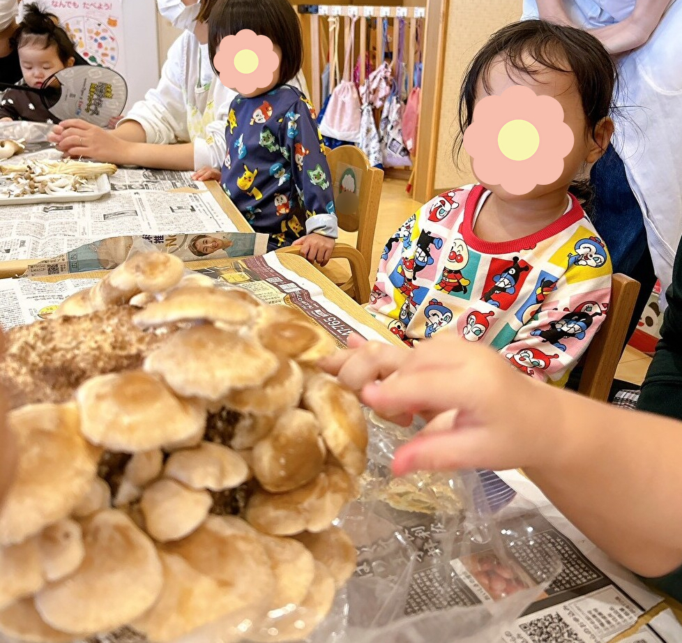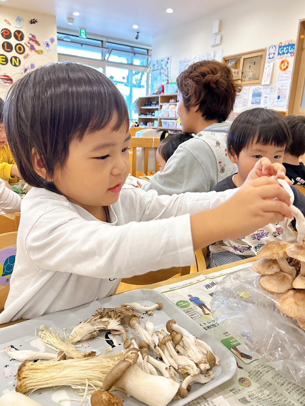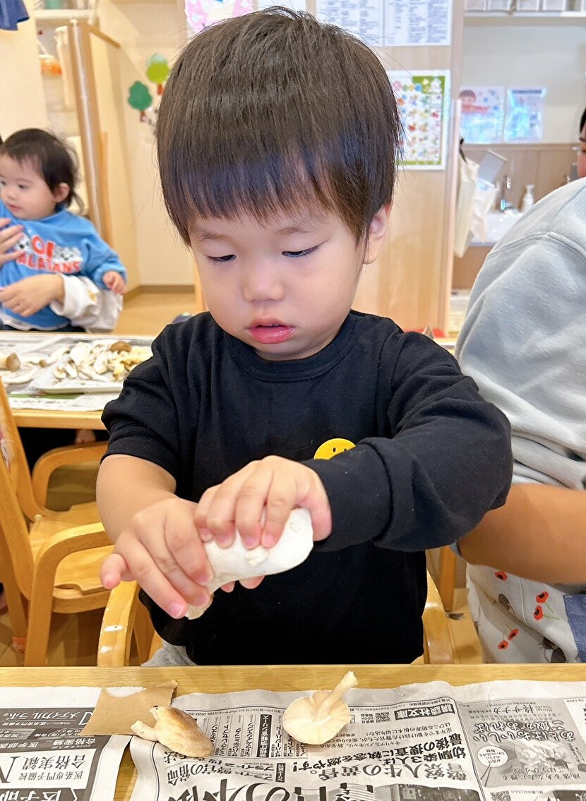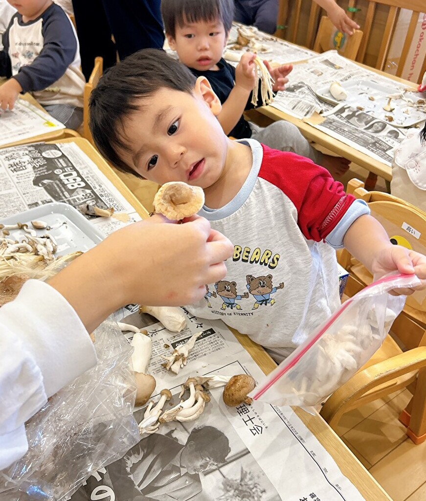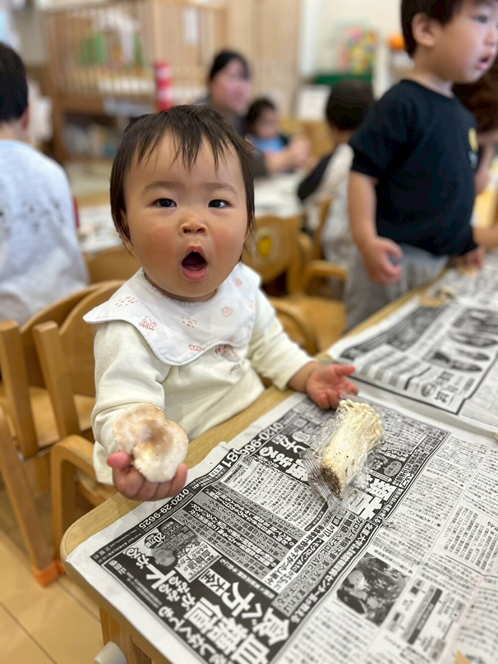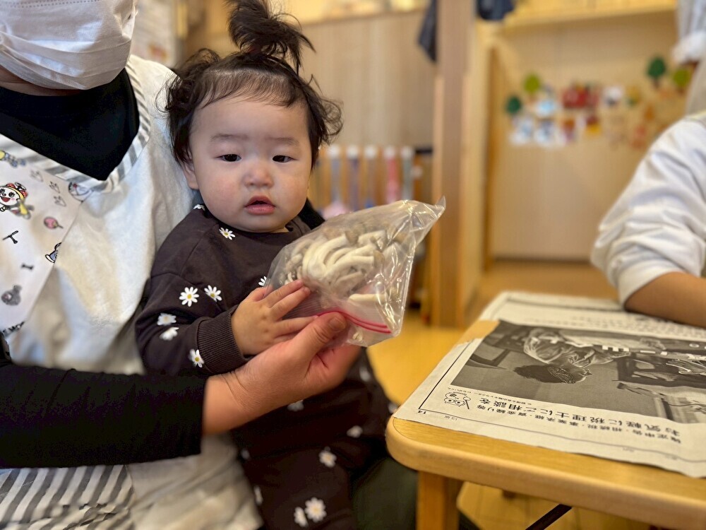 ひよこぐみさんは袋に入ったきのこを不思議そうに観察したり触ったりしていました♪
