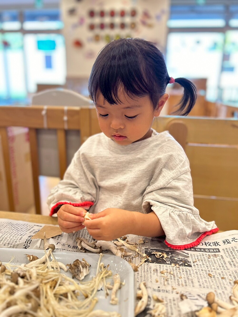 今日は食育の一環としてきのこの観察をしました☆給食の先生がいろいろな種類のきのこを用意してくれました!