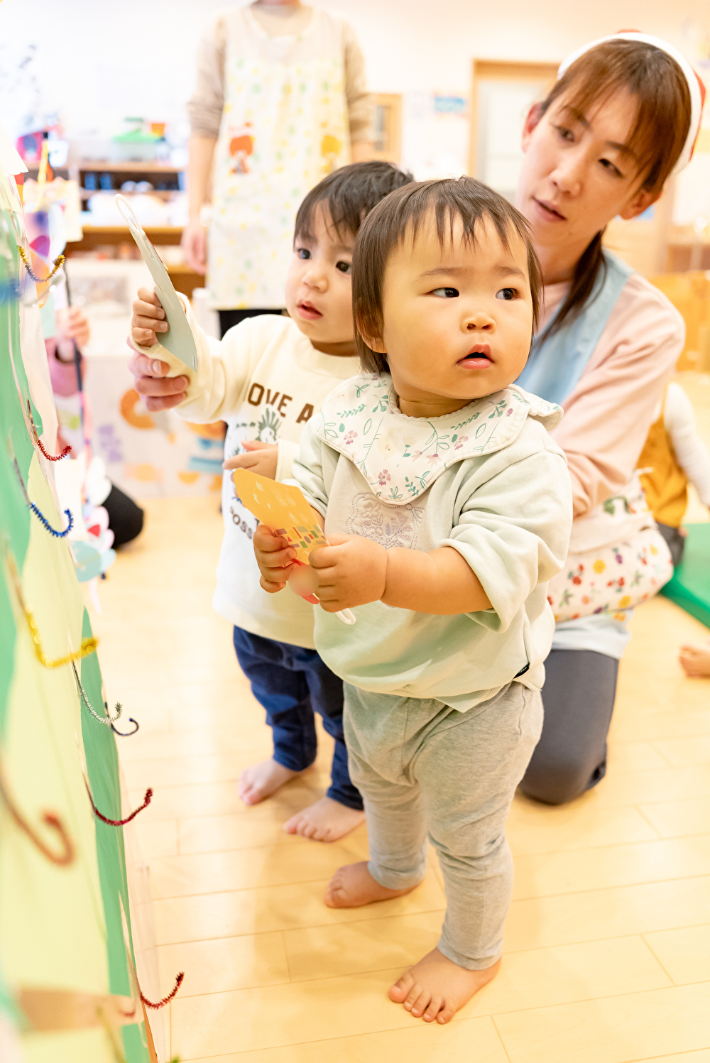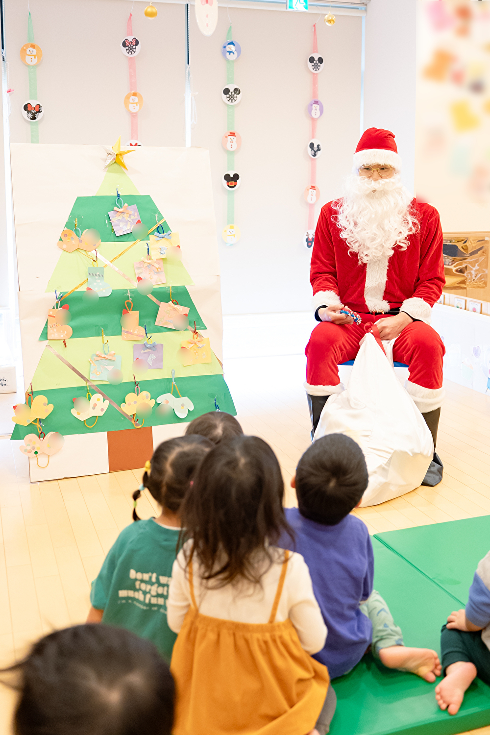 背の高いサンタさんにドキドキの子どもたち!みんなで作ったツリーを見てもらいました。サンタさんに喜んでもらえて良かったね♡