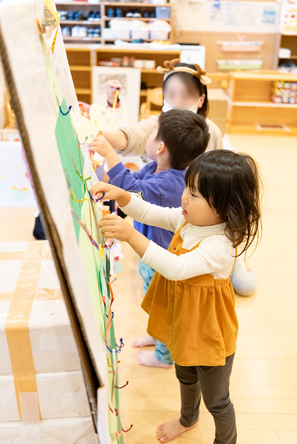 ねずみちゃんたちのように、みんなでツリーを飾ろう!!こどもたちが自分で制作した素敵なオーナメントを飾りました。